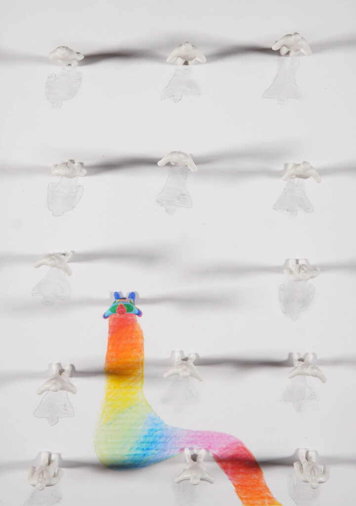Alle Menschen versuchen sich anzupassen, aber wer anders ist fällt auf und macht sich angreifbar. Die Schatten symbolisieren die Spur die man hinterlässt.