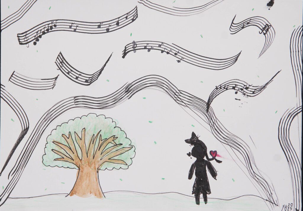 Ich stehe an einem Baum mit einer Katze auf der Schulter. Wir beide lieben die Musik.