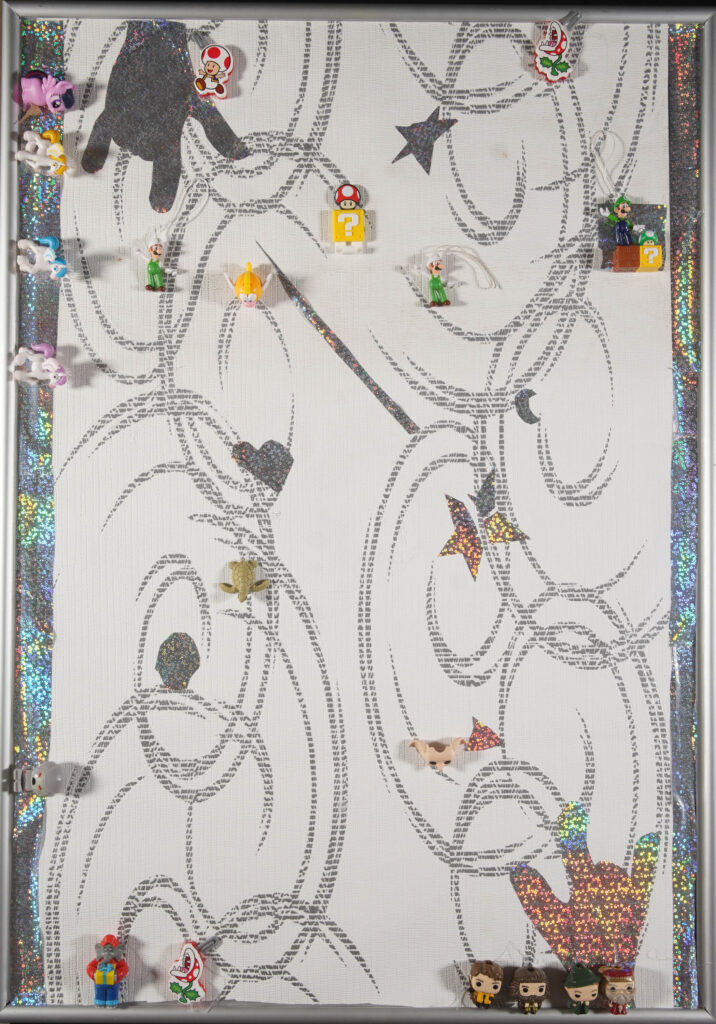 In dem Bild sieht man Figuren aus verschiedenen Filmen, mit denen ich als Kind gespielt habe und der Hintergrund ist meine Kreativität die immer größer wird.