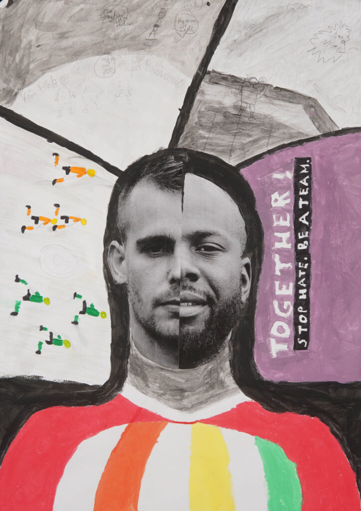 Ich wollte zeigen was der Fußball für Maßnahmen gegen Rassismus unternimmt und auf ein Zusammenspiel von Bunt und Schwarz achten.