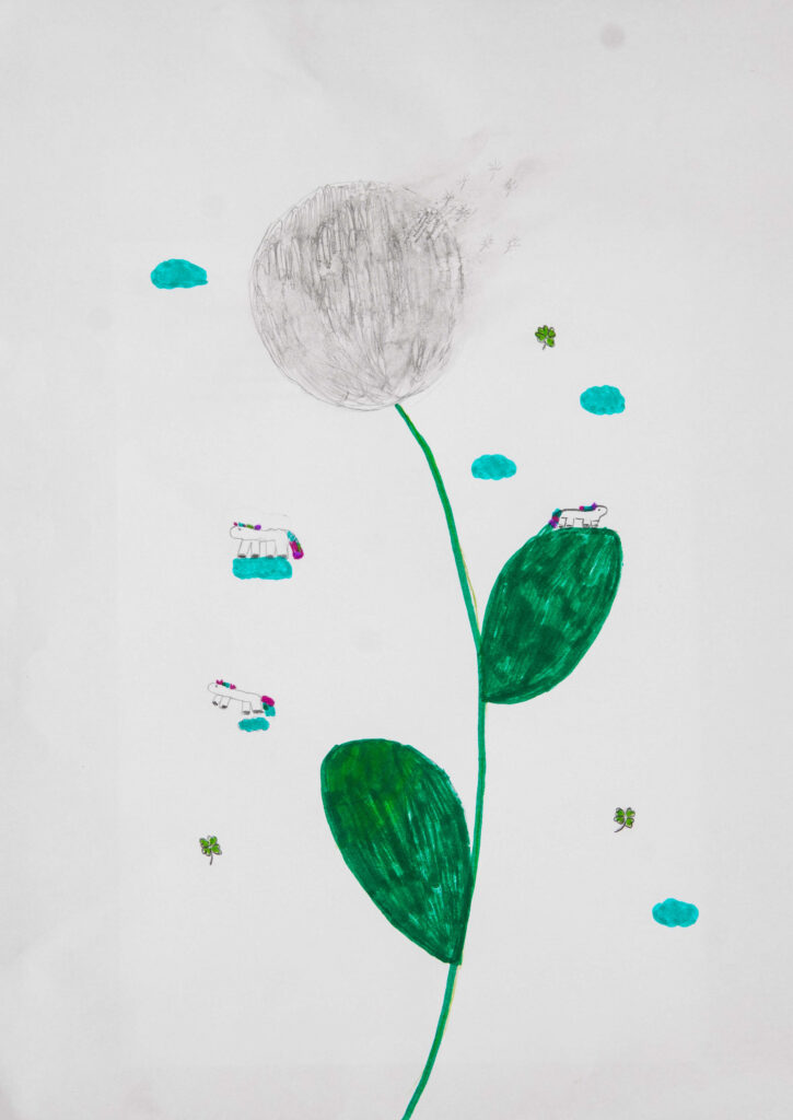 Die Pflanze ist eine Pusteblume und die Einhörner stehen auf Wolken.
