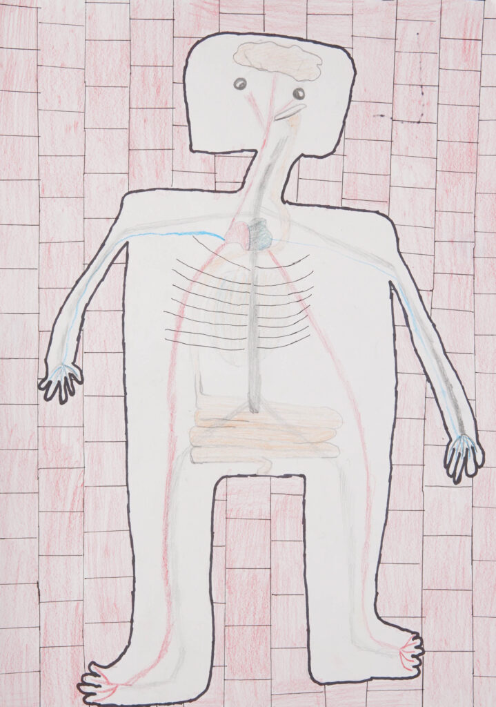 Mein Kunstwerk stellt einen Körper von innen da, den ich vor einer Mauer gezeichnet habe.
