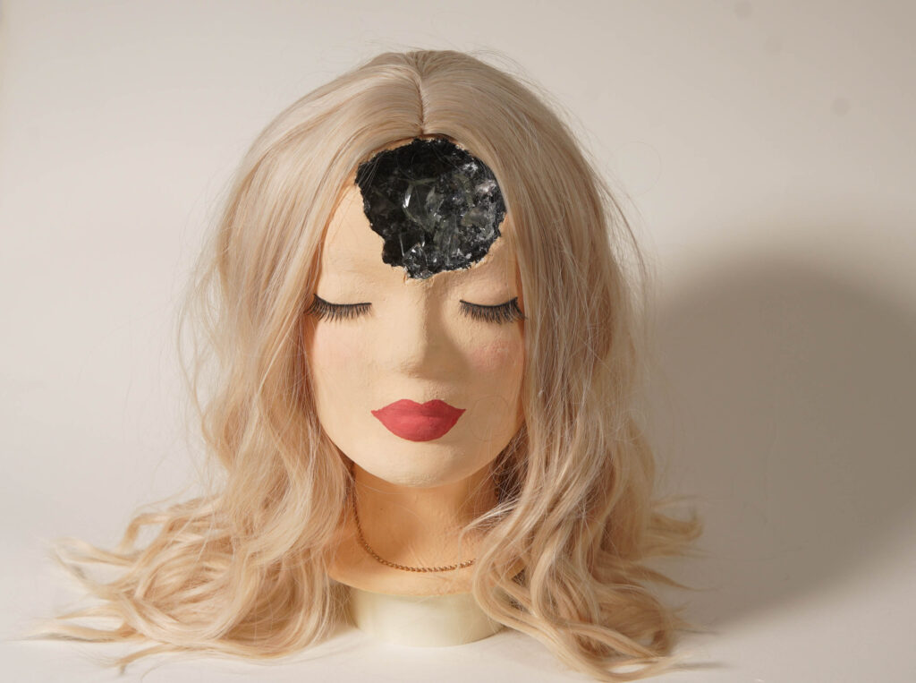 Das Kunstwerk zeigt ein makelloses, geschminktes Gesicht mit geschlossenen Augen, das nach außen hin Ruhe und Perfektion ausstrahlt. Doch im inneren eröffnet sich ein zerbrochener Hohlraum, der die verborgenen Brüche und Verletzlichkeit sichtbar macht.